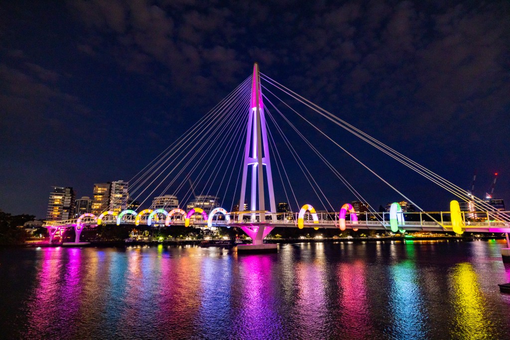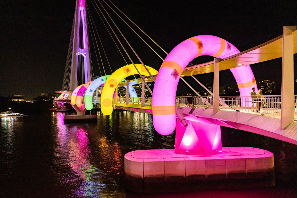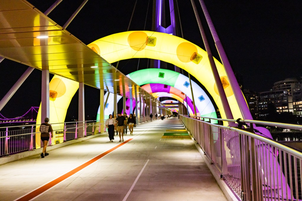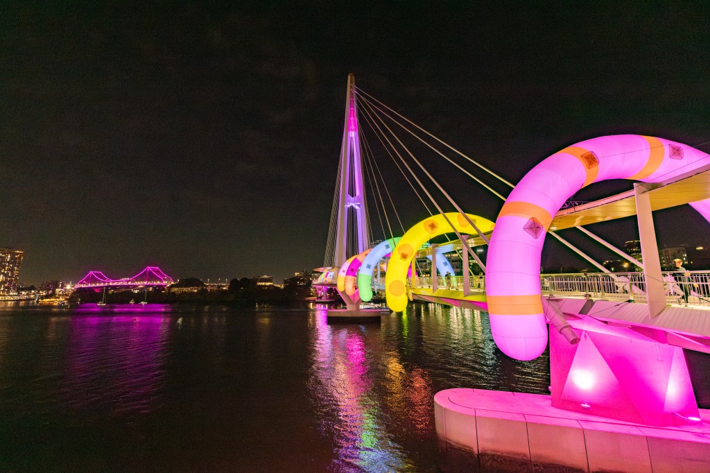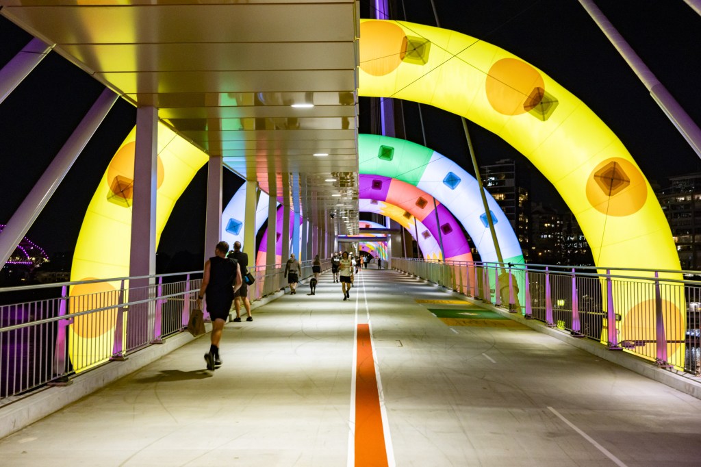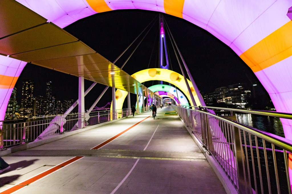 The first shot in the series above was totally by accident where I must have accidently pressed the shutter – I did like the result though. It was a shot taken on the way to the Afterglow event, on the newest walk bridge across the Brisbane River. Very colourful cartoonish hoops spanning the bridge made for quite the sight!