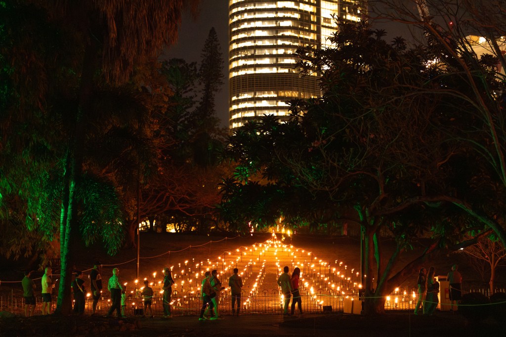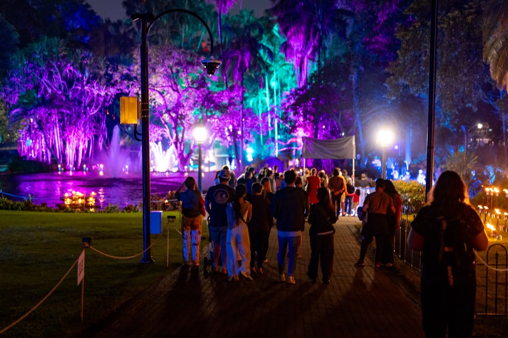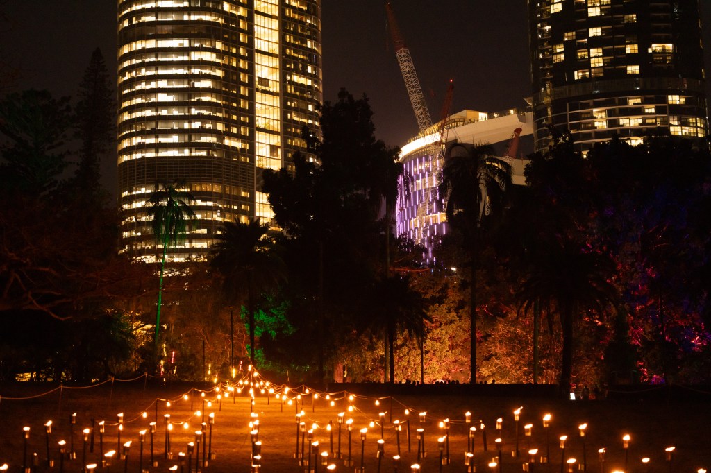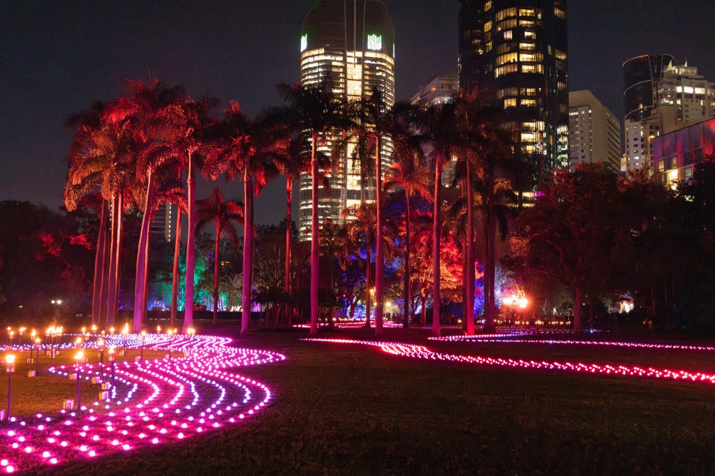 Brisbane City Botanical Gardens was host to Afterglow as part of this years festival – a walk through the park IKEA like style, wandering along the paths to experience displays of light and sound. This was a ticketed event so there were not hoards of people and the walk through the gardens looking at the various displays made the night so much better.