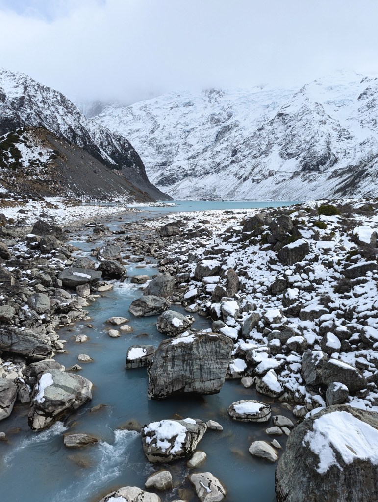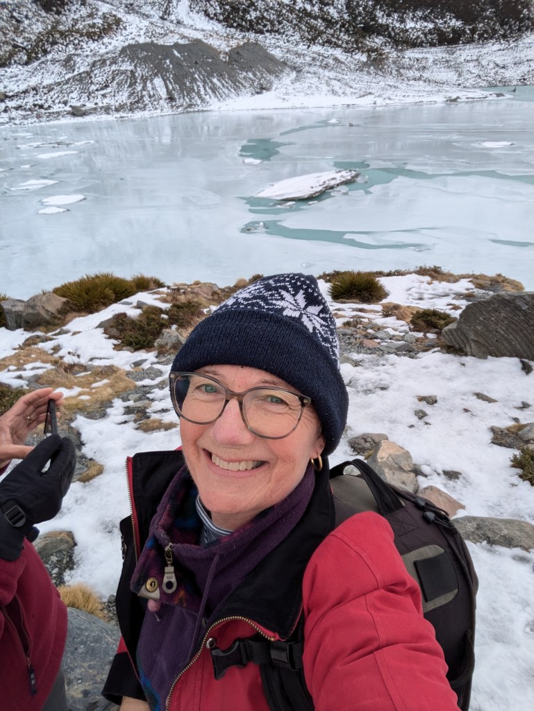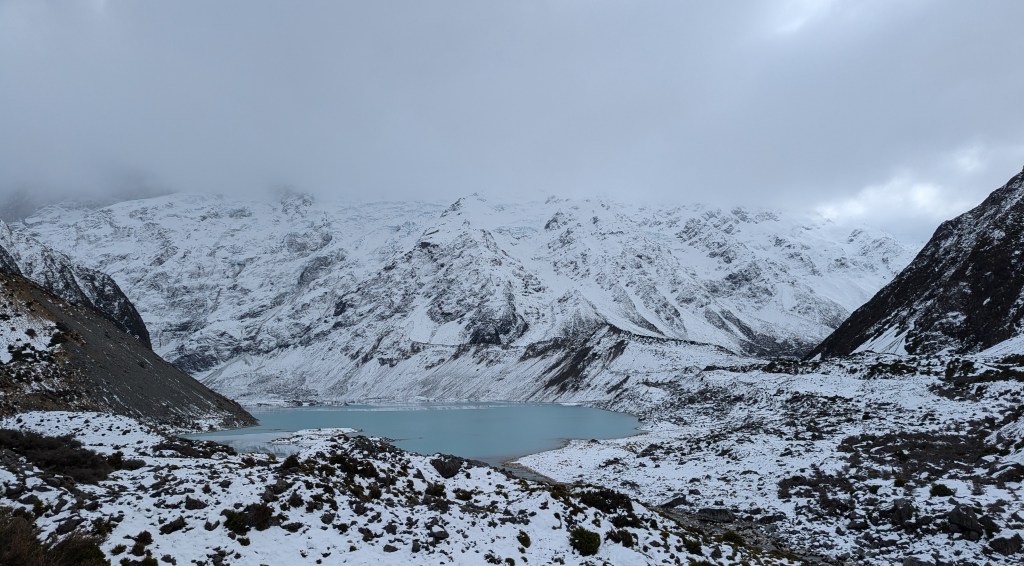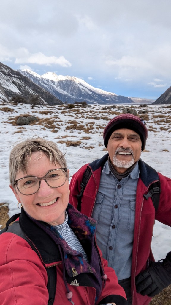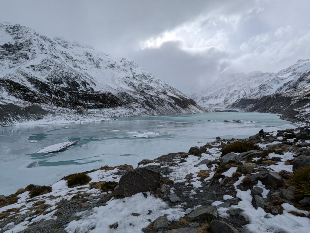 Once the morning had lost its colours, the plan was to walk the Hooker Valley track. Mount Cook Road leading up to the Hermitage and the beginning of the track is always a picturesque drive. However the overcast weather was a foreshadow of the conditions we were going to encounter on the walk with ice and snow making even walking up steps rather treacherous. The song Slip Sliding Away became the anthem for the day!
